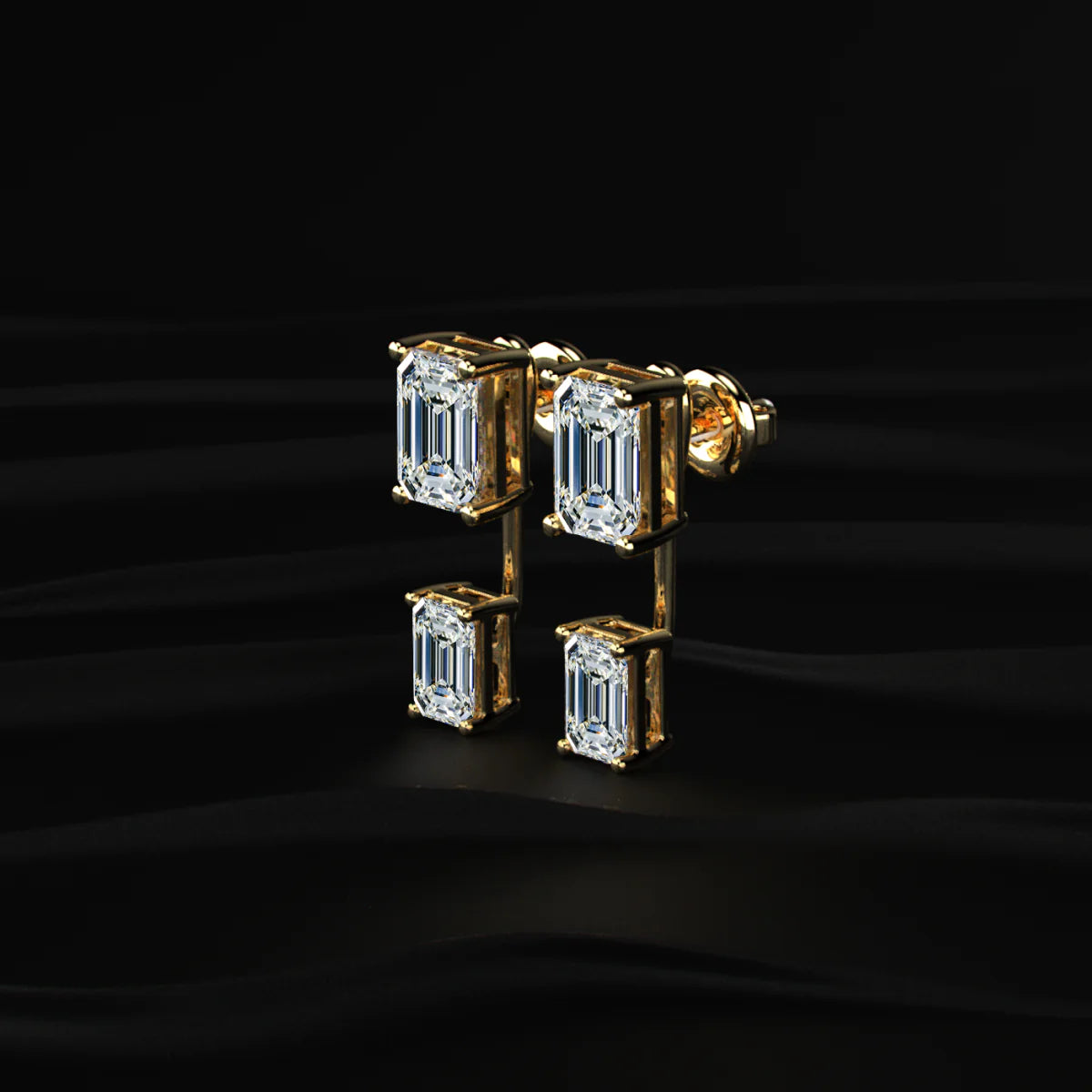 Sleek, modern, and effortlessly stylish – these stud earrings feature two vertically aligned emerald-cut stones set in a polished gold frame. The step-cut brilliance of the stones creates a sophisticated sparkle, perfect for both formal occasions and evening wear. A screw-back closure ensures secure and comfortable wear throughout the day.