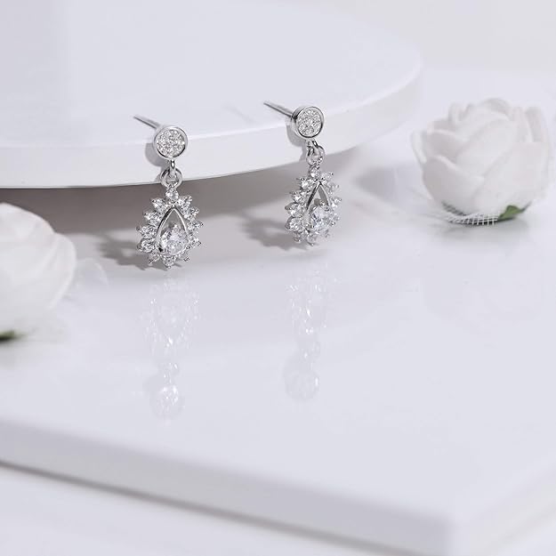 Sterling Silver Teardrop Dangle Earrings with CZ Halo