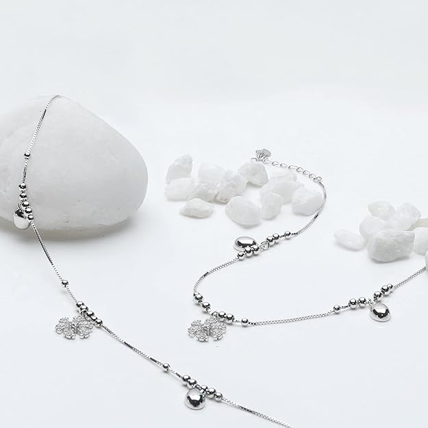 This exquisite anklet combines the elegance of sterling silver with delicate charm details for a graceful, feminine look. The centerpiece features a beautifully crafted floral pendant adorned with tiny petal-like accents, flanked by two oval charms and fine bead stations along the chain. Its lightweight and comfortable design make it perfect for both everyday wear and special occasions.