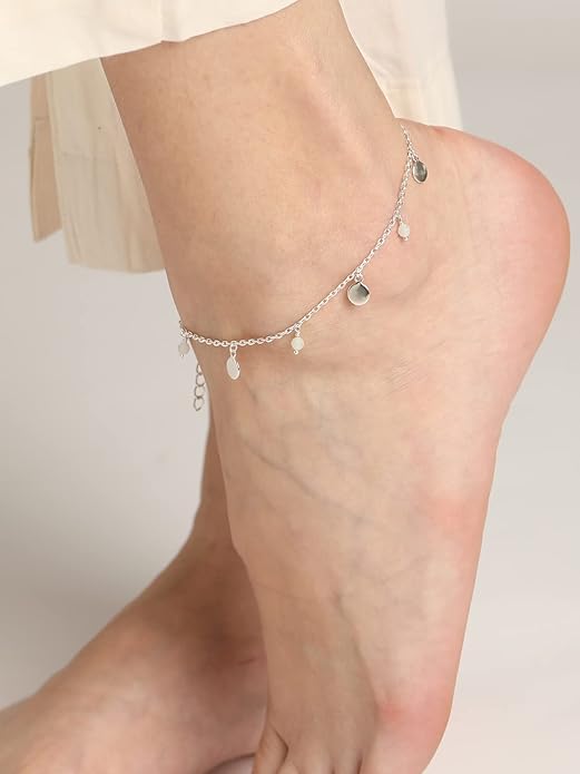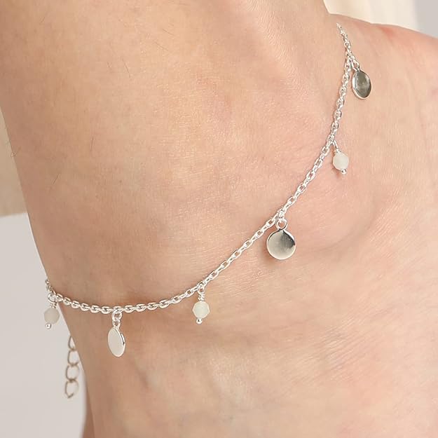 A delicate sterling silver anklet adorned with polished disc charms and dainty beads, perfect for adding a subtle sparkle to your everyday look.