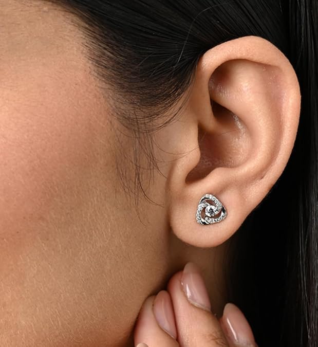 Add a timeless sparkle to your collection with these stunning swirl-design stud earrings. Crafted in high-polish sterling silver, each earring features a central round-cut stone embraced by a graceful spiral of shimmering accents. The triple-looped swirl design gives these earrings a sophisticated yet modern look, perfect for both everyday wear and special occasions.