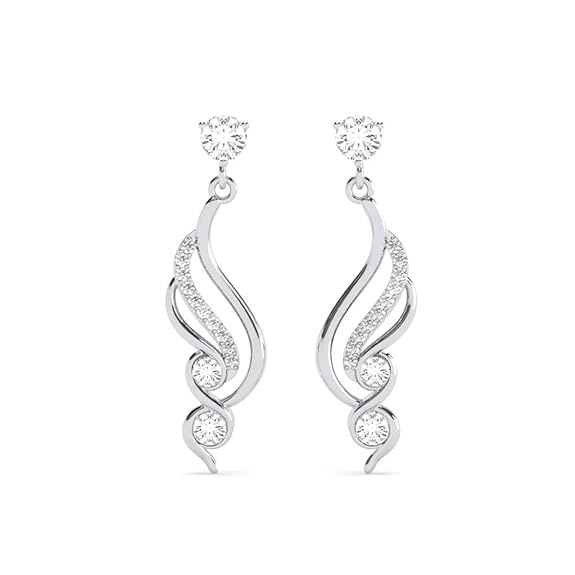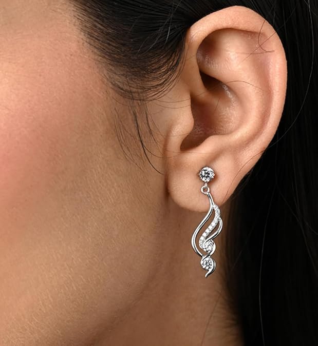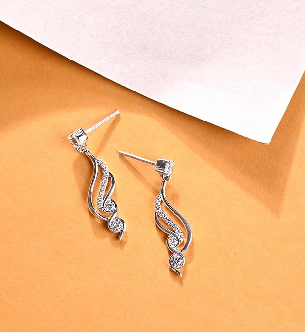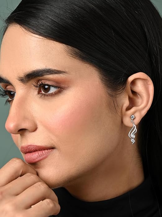 These long, graceful drop earrings feature a sleek swirl design adorned with sparkling white stones. The delicate curves and high-polish silver-tone finish exude sophistication, making them a perfect accessory for formal evenings or classy day events.