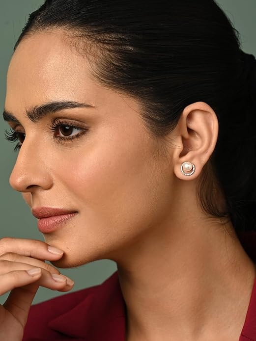 These elegant silver-tone earrings feature a unique half-moon design embellished with sparkling cubic zirconia and a central synthetic pearl. The minimalist yet luxurious look makes them a perfect accessory for both casual and formal occasions. A timeless addition to any jewellery collection.