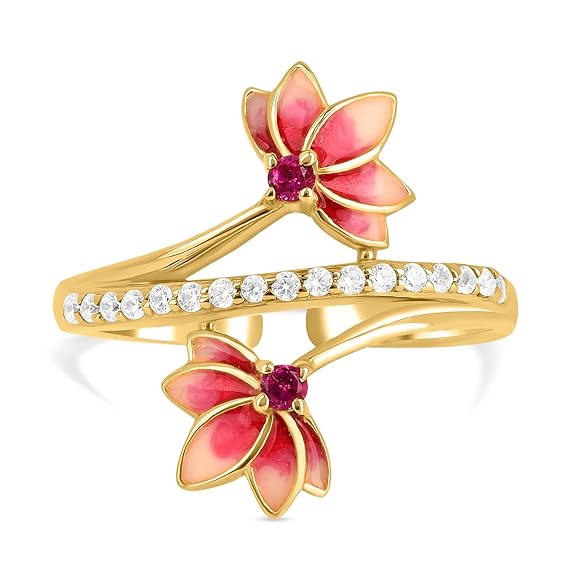 An exquisite harmony of color and sparkle, this gold-tone ring features two vibrant pink enamel flowers accented with shimmering diamond simulants. Its elegant open-band design and detailed craftsmanship make it a standout accessory for any occasion.