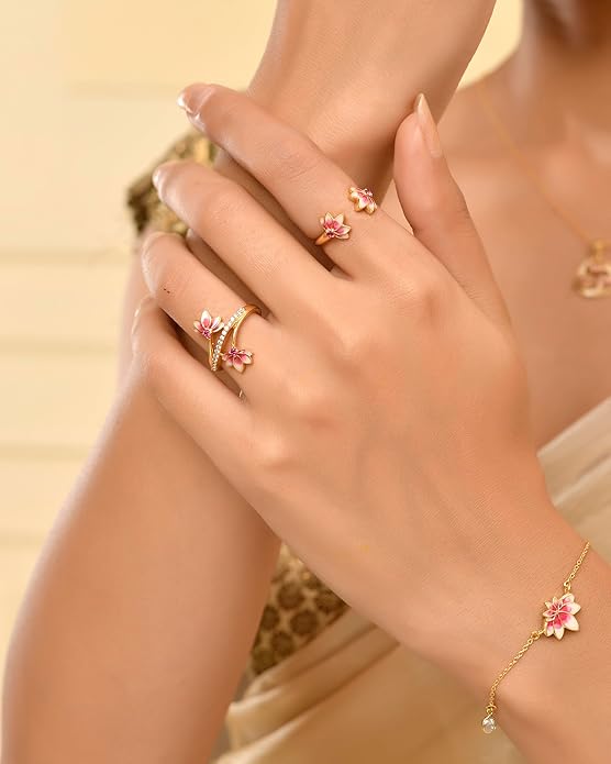 Design: Dual floral motifs with pink enamel petals and ruby-tone center stones