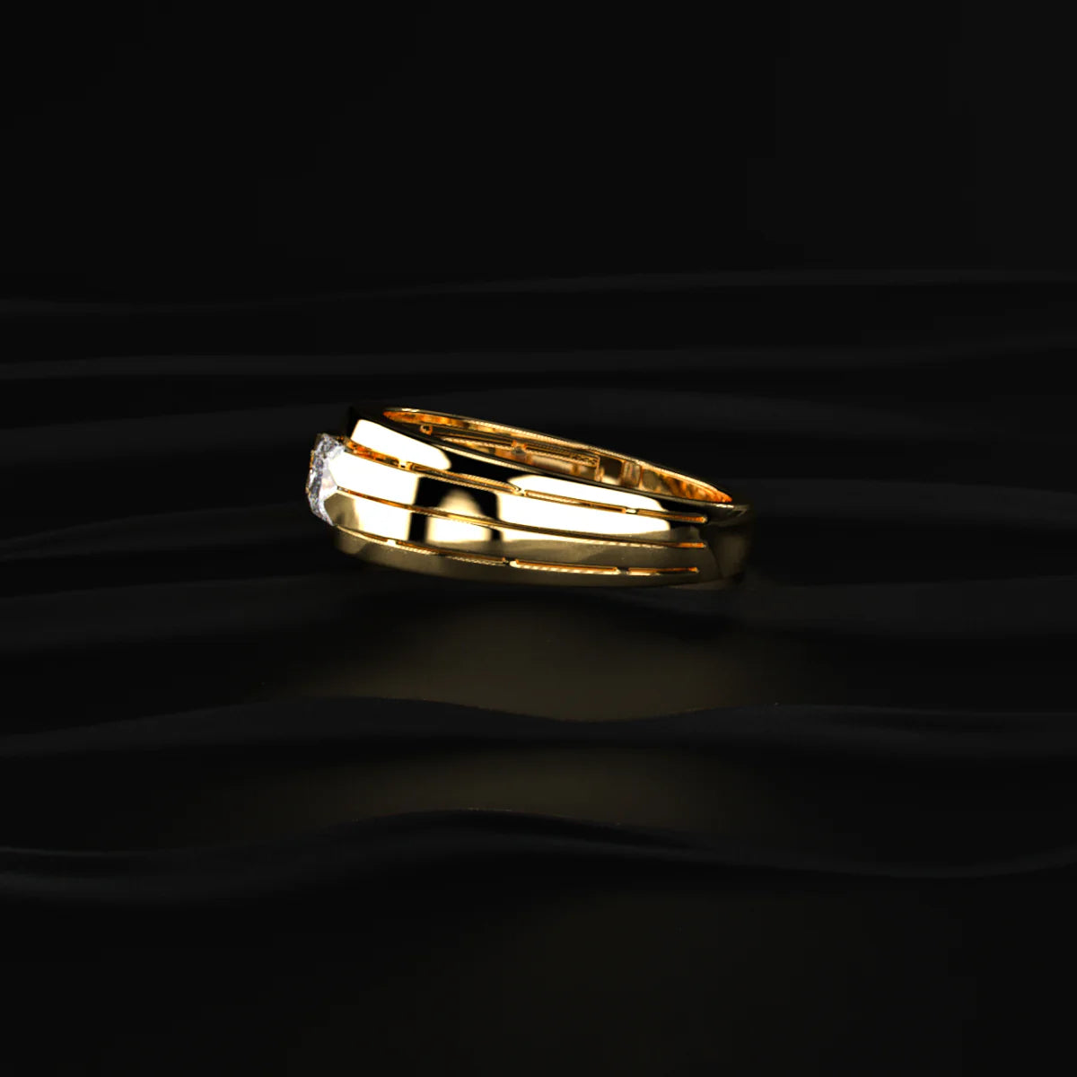 Striking and sophisticated, this men’s ring blends modern design with timeless sparkle. Crafted in solid 925 sterling silver and finished with luxurious 18K yellow gold plating, it features a sharp princess-cut solitaire at its heart. The bold triple-groove detailing along the band adds dimension and strength, creating a powerful statement of style. Perfect for the man who values both elegance and individuality.