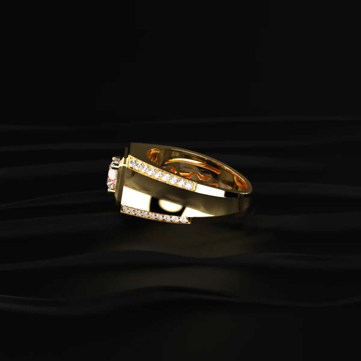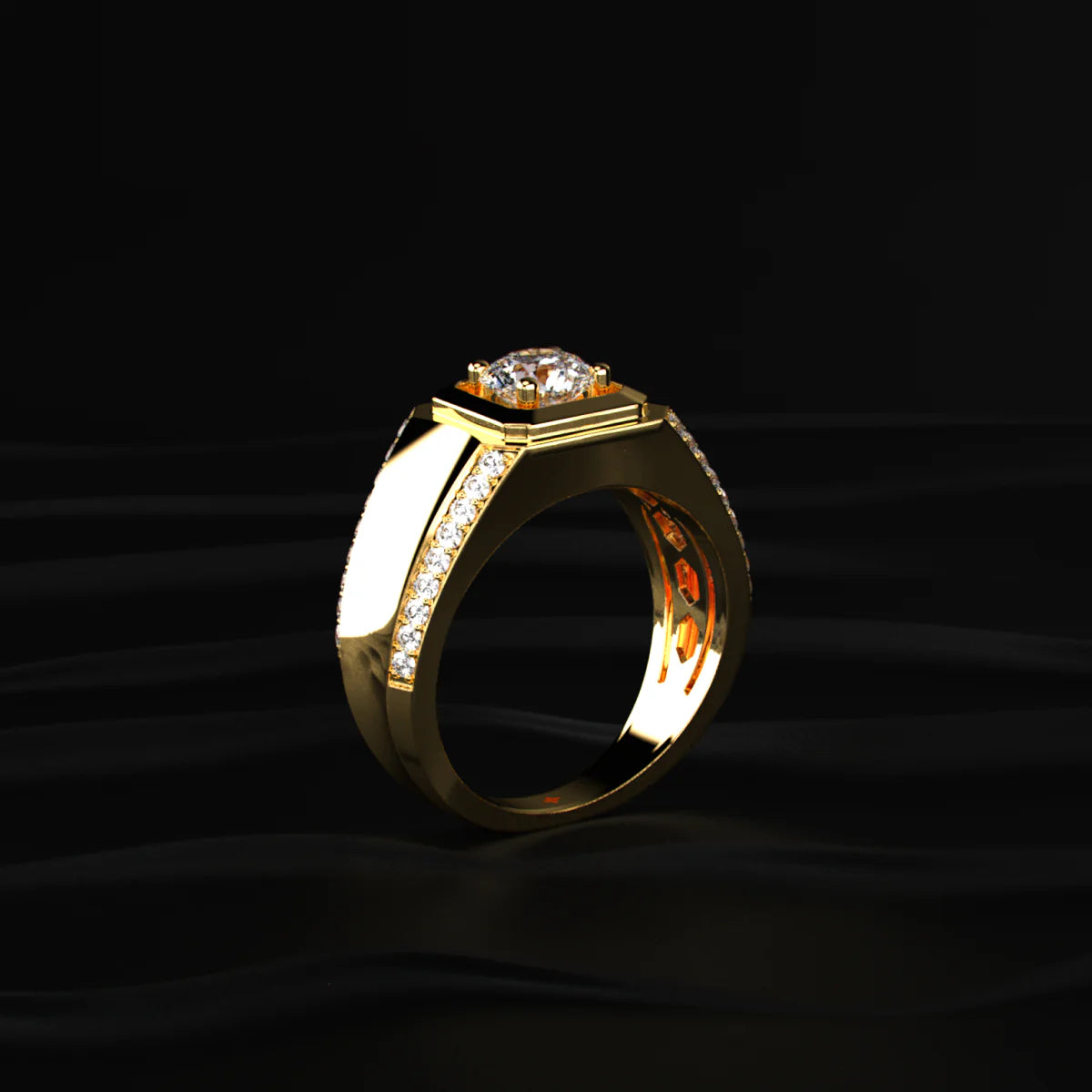 Bold geometry meets refined craftsmanship in this men’s gold solitaire ring. Crafted in solid 925 sterling silver and luxuriously plated in rich 18K gold, the design features a commanding central round-cut stone securely set in a square bezel with four claw prongs. The shoulders are accented with micro-pave stones, adding a subtle halo of brilliance without overpowering its masculine charm. This ring radiates power, prestige, and timeless elegance.
