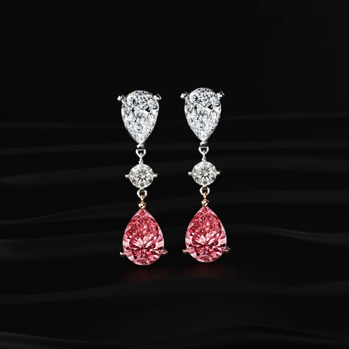 Elevate your elegance with these stunning two-tone teardrop dangle earrings. Featuring a brilliant white pear-cut stone at the top, followed by a sparkling round-cut accent, and finished with a radiant pink pear-cut drop, this design exudes sophistication and charm. Crafted in high-quality 925 sterling silver, these earrings bring together timeless sparkle and a modern splash of color – perfect for evenings, celebrations, and statement-making style.