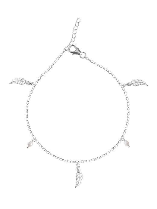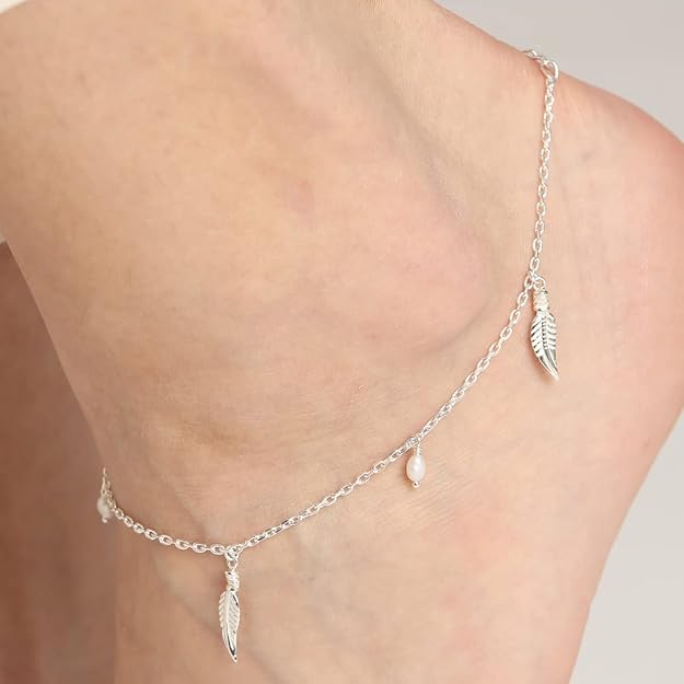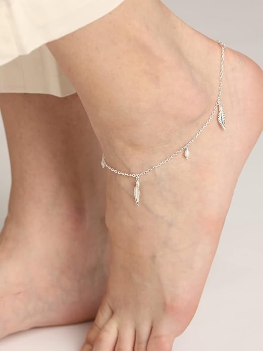 Sterling Silver Leaf & Pearl Charm Anklet | 925 Sterling Silver Anklet Payal (Single) | Adjustable Chain | Gift for Women and Girls